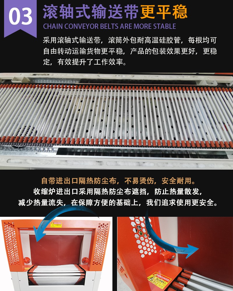- 热收缩机还可以根据产品的特殊要求进行定制化设计,例如对于一些需要特殊保护的产品,可以增加缓冲材料或采用特殊的收缩膜材质。