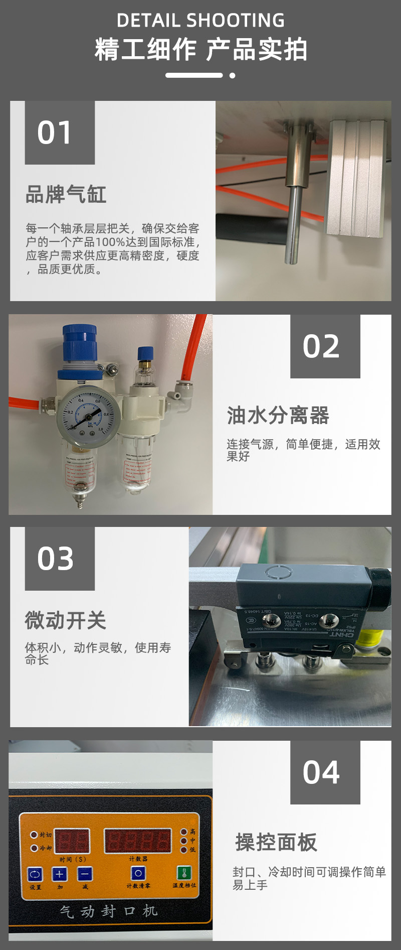 3. 定期维护保养:定期对气动封口机进行维护保养,检查气缸、加热元件、控制系统等部件的运行情况。及时更换磨损的部件,确保设备的正常运行。