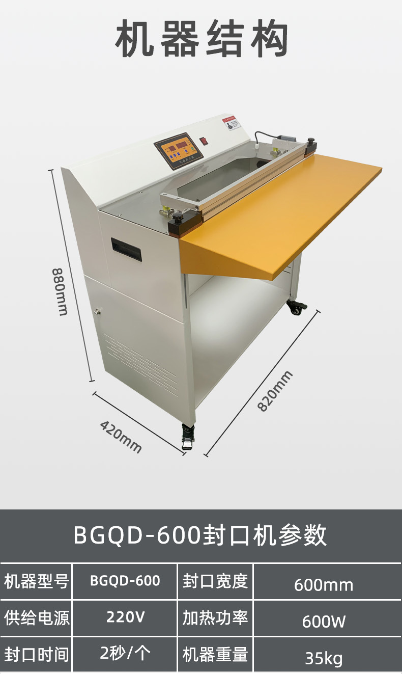 3. 操作简单:设备操作简单,只需将包装材料放置在封口位置,按下启动按钮即可完成封口操作。