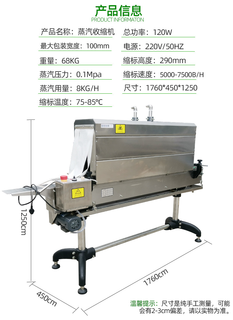 - 加热室:产品在加热室内接受蒸汽的加热,使收缩膜收缩。加热室的设计应确保蒸汽均匀分布,以保证收缩效果的一致性。