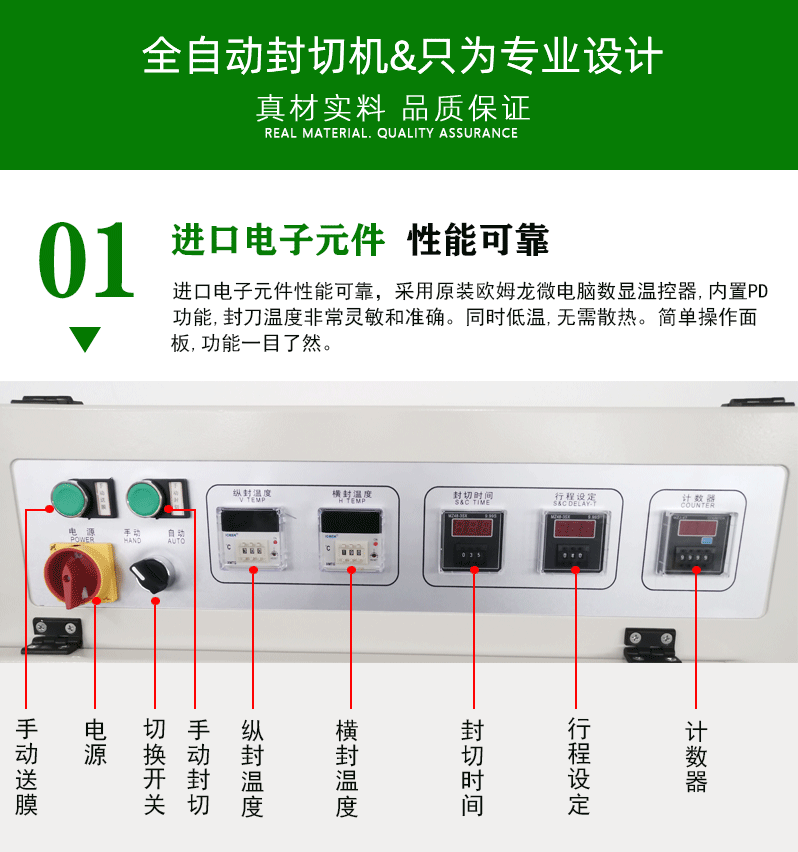 - 负责对整个全自动封切机的运行进行全面控制,包括启动、停止、调节输送带速度、设定封切温度、控制薄膜张力等操作。操作人员可以通过控制面板方便地对各项参数进行设置和调整,同时,一些先进的控制系统还具备故障诊断和报警功能,当设备出现异常情况时,能及时提醒操作人员进行处理,保障设备的正常运行。