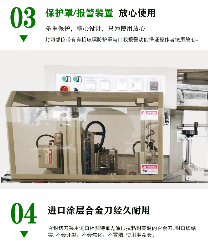 - 在物品被薄膜包裹后,封切装置会立即启动。封切装置一般采用横向(水平方向)或纵向(垂直方向)的封切方式,对薄膜的封口部位进行加热,使其达到适宜的温度,然后利用压力装置施加一定压力,使加热后的薄膜相互粘结融合,完成封口动作。