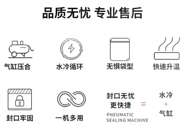 - 与非水冷式封口机相比,水冷封口机的封口更加平整、美观。冷却过程使得封口处的材料均匀收缩,减少了封口起皱或变形的情况,提升了产品包装的整体外观质量。