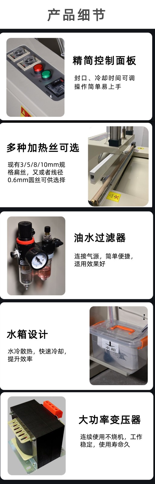 - 水冷系统能使封口快速冷却,这样可以让封口处的材料在短时间内从熔融状态转变为固态,从而形成紧密、牢固的封口。例如,在包装含有粉末状物质的袋子时,如奶粉袋,水冷封口机能够有效防止粉末泄漏,因为其封口强度高,能够承受一定的压力和摩擦。