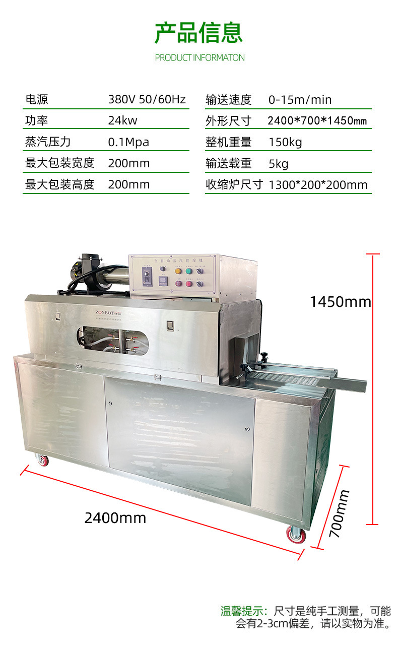 蒸汽式热收缩机本机特点:蒸汽式热收缩机是一种新式热收缩包装机,具有了自带蒸汽发生器,也可适用于外部蒸汽管道的场所,并配置有漏电保护开关,缺水报警保护,自动补水等体系,更好地提高运用安全等级,收缩速度快、效果好,特别是对玻璃瓶、金属外壳、带液体的容器有较好的收缩效果。