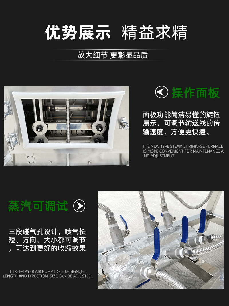 蒸汽收缩机是一种设计精巧、外型美观的设备,具有不占空间、移动和安装迅速快捷的特点,以及超大范围的调节能力,使其能够适用于各种输送带和滑道。这种机器通过吸收国外先进技术并结合国内现状,能够自动收集、整理、堆放各种包装材料,克服了国内同类机器容易震动的堆叠不稳定、易卡、不适应重量轻、体积小的小盒产品的缺点,拓宽了机器在包装领域的适应性和能力。此外,蒸汽收缩机的整机电气元件全部采用日本三菱、欧姆龙制造,设备运行稳定可靠,受到相关行业客户的好评。它可以单独完成小盒的中间包装,也可以连接前端的套膜机和后端的装盒机,不需要增加特殊的机械装置。包装后的产品外观光滑整齐,包裹严密,焊接牢固。