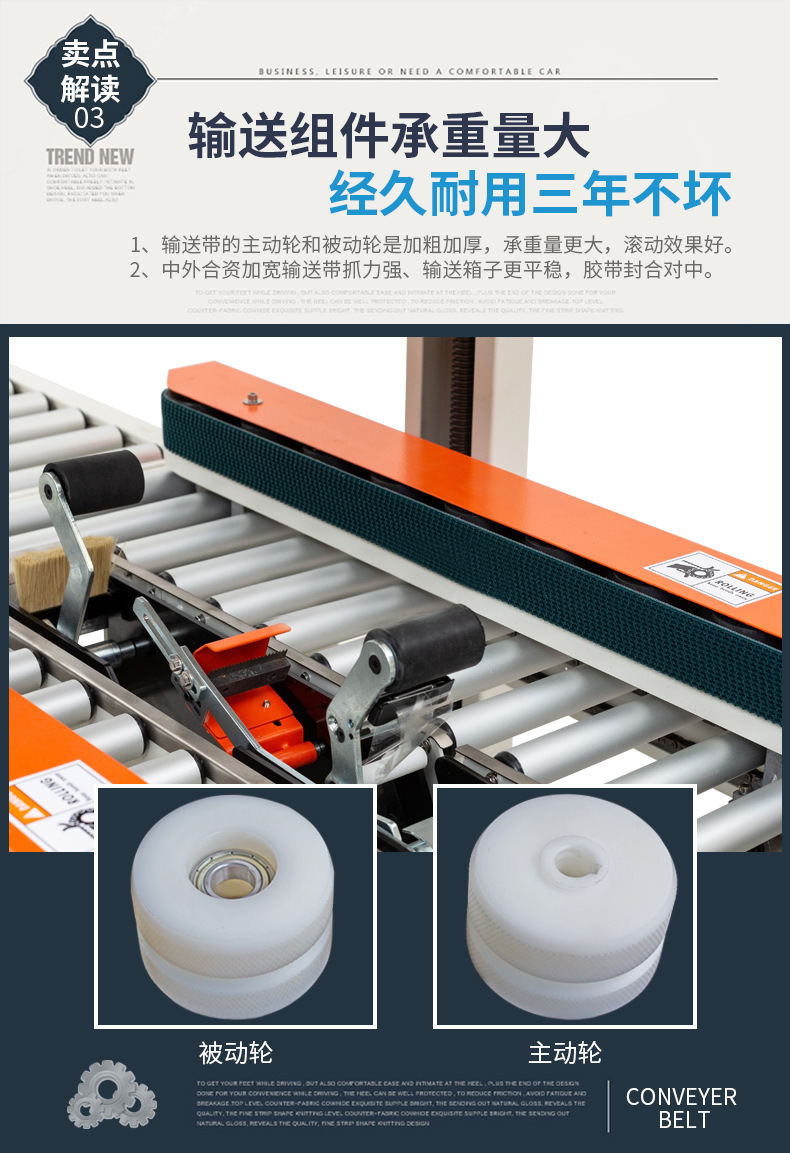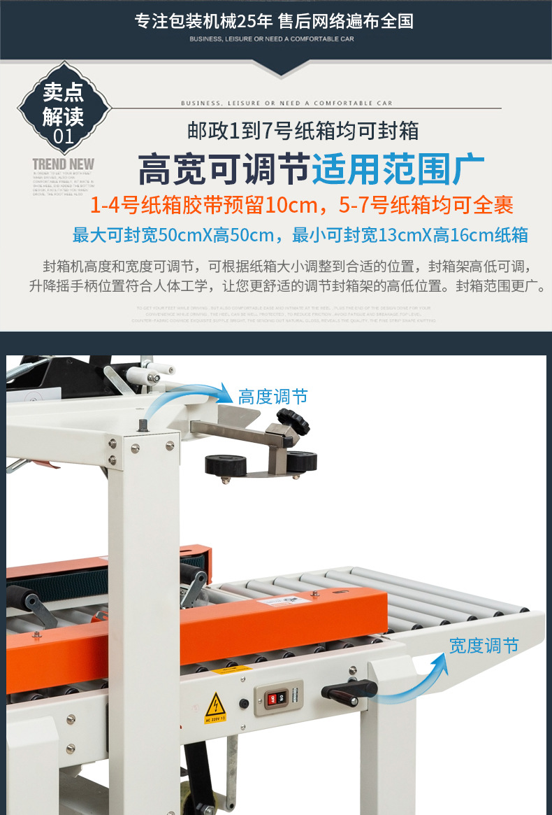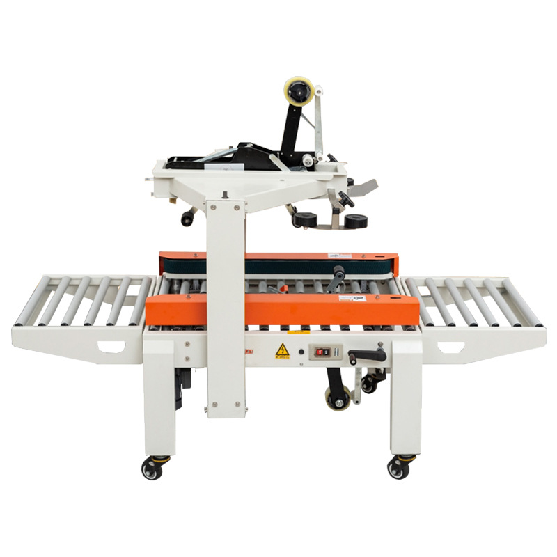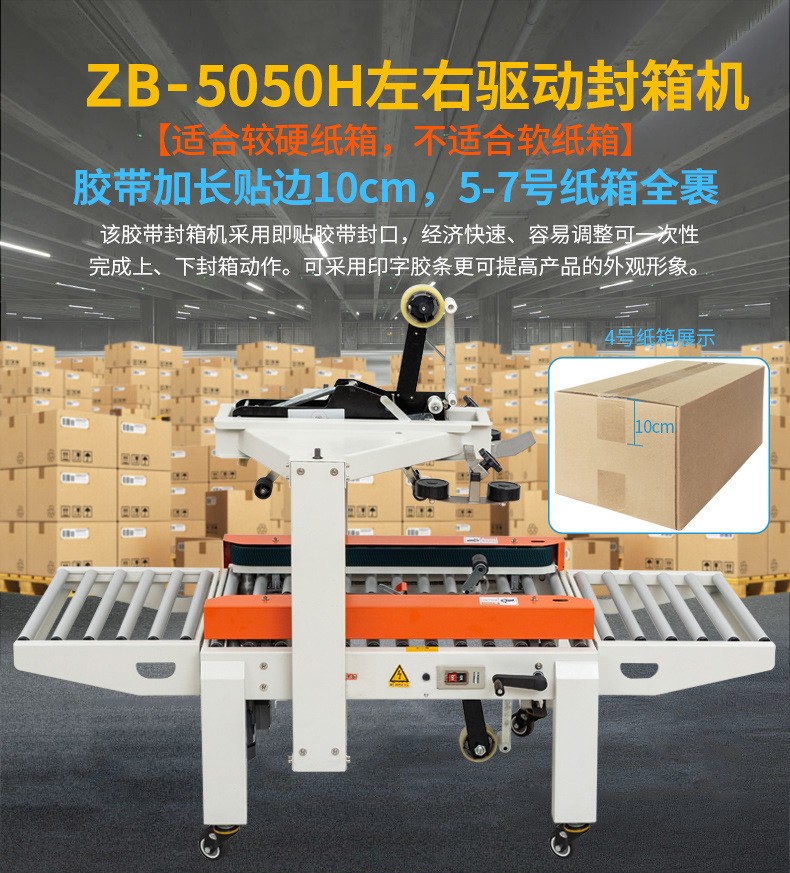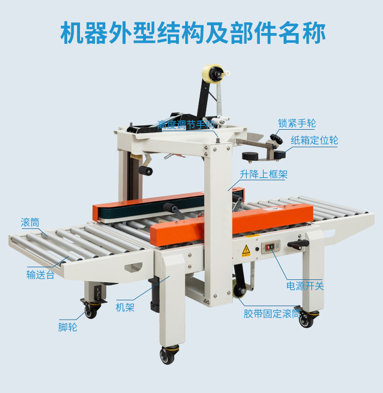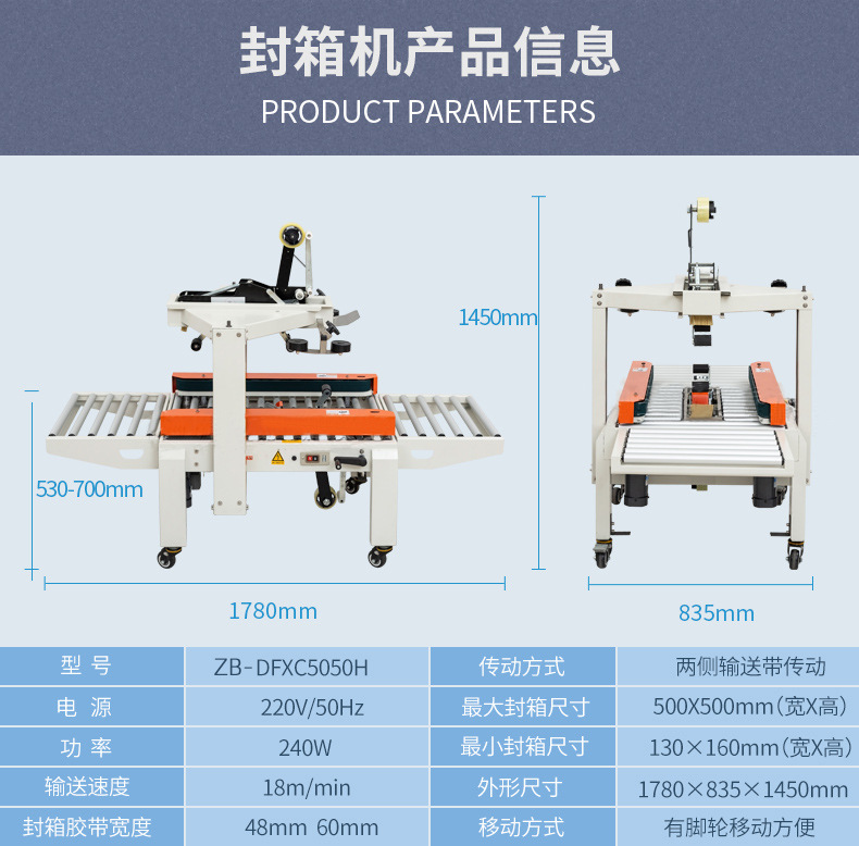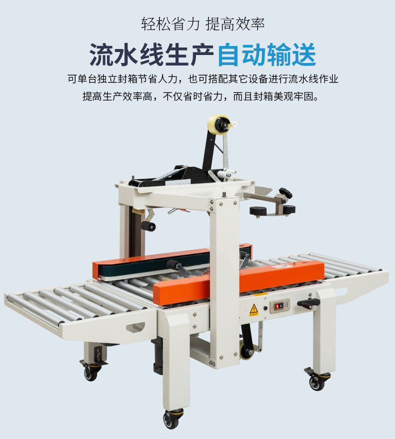 纸箱自动封箱机具有广泛的用途,适用于家用电器、纺织、食品、日用百货、药品、轻工、化工等各种行业产品包装、纸箱的封箱,可单独封箱作业,亦可与充填、捆包配套成流流水线使用,为包装标准流水线作业所必需的设备。 自动调整不同规格的纸箱高度与宽度。 侧边驱动式自动校正调整、送箱、运转平稳
