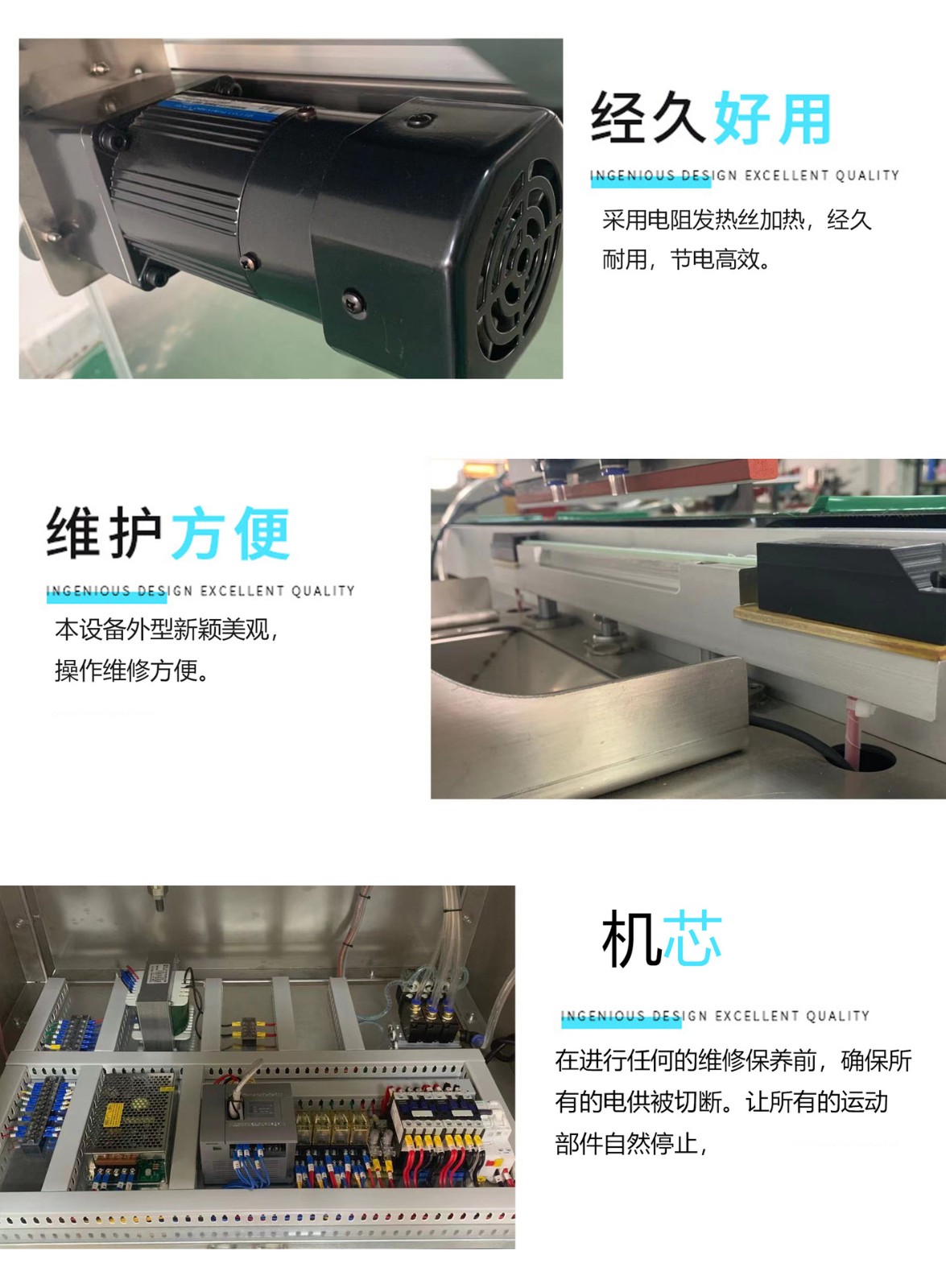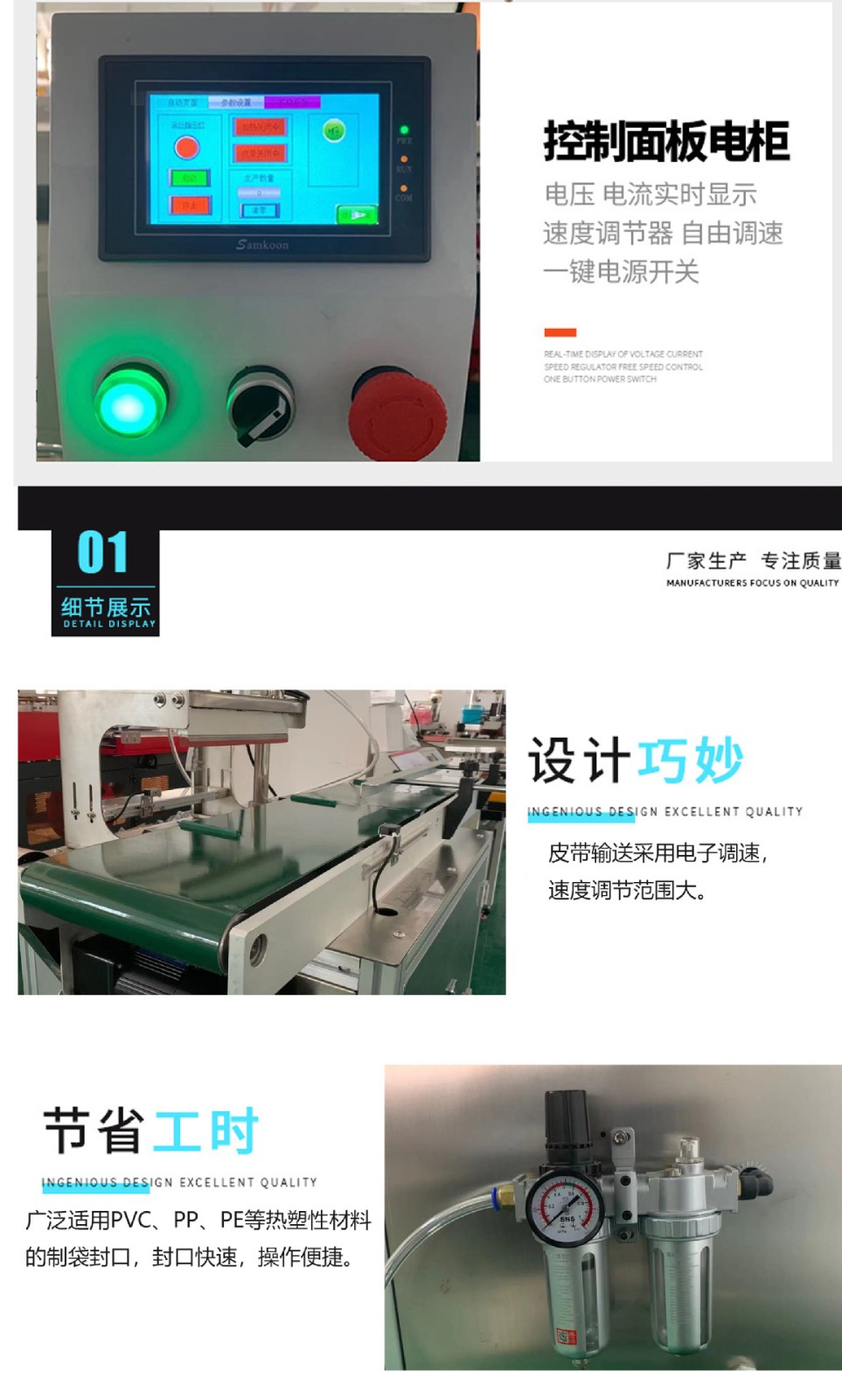 空封口机是将食品装入包装袋,抽出包装袋内的空气,达到预定真空度后,完成封口工序。可以有以下功能:1、对袋子进行抽气+封口;2、直接对袋子口封口;3、对袋子进行抽气+充入氮气或其他气体+封口 封口机简介 抽真空封口机有多种型号,有手压式的,有立式的等多种规格