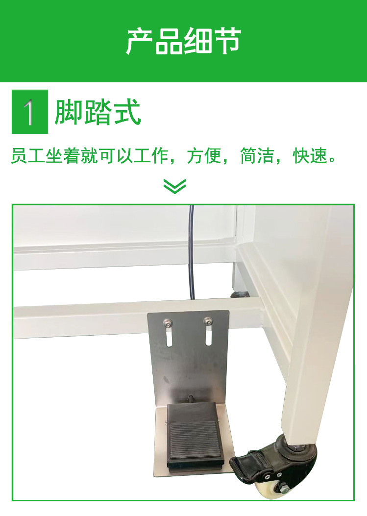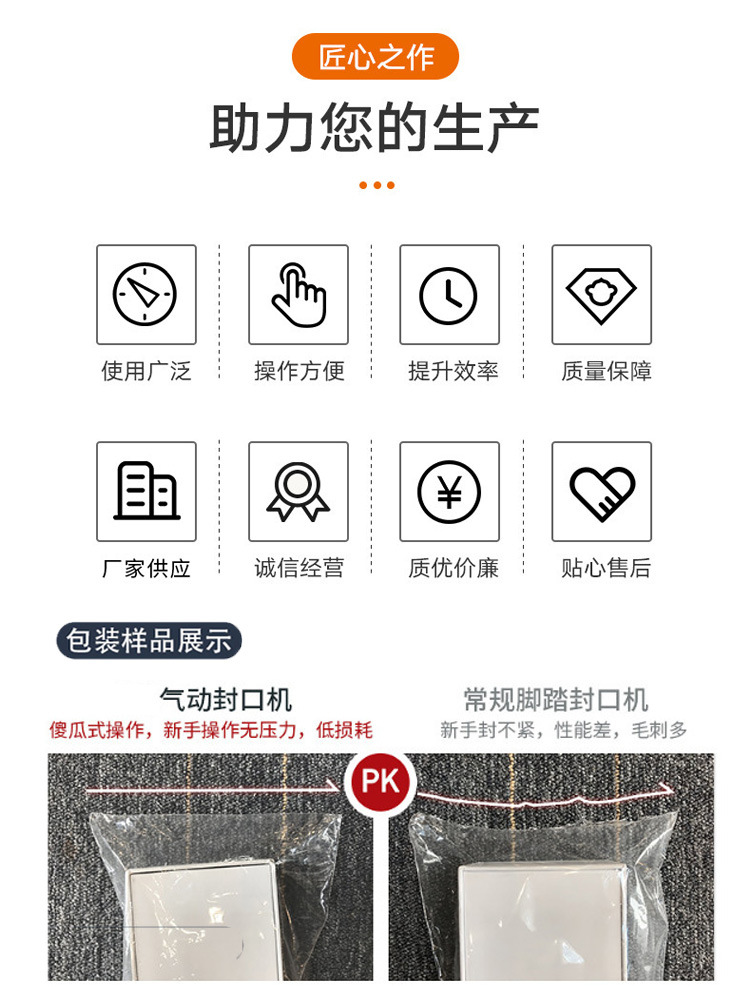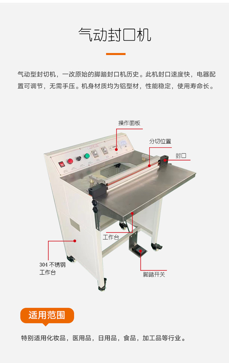 机器采用的是不锈钢材料制成,利用压缩空气作为动力,封口的压力可以进行调试,根据产品的不同选择合适的压力指数。设备稳定可靠,可以手动操作也可以脚踏操作,简单方便。
