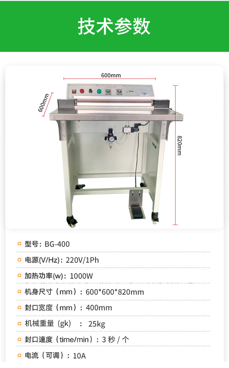 塑料薄膜封口机主要对于一些封口长度小于600mm、重量小于50kg的塑料袋或复合袋的间歇包装封口,特殊情况的订货可以将封口长度增大至700mm、800mm、1000mm,它还可以直接与连接的输送台和生产流水线配套。