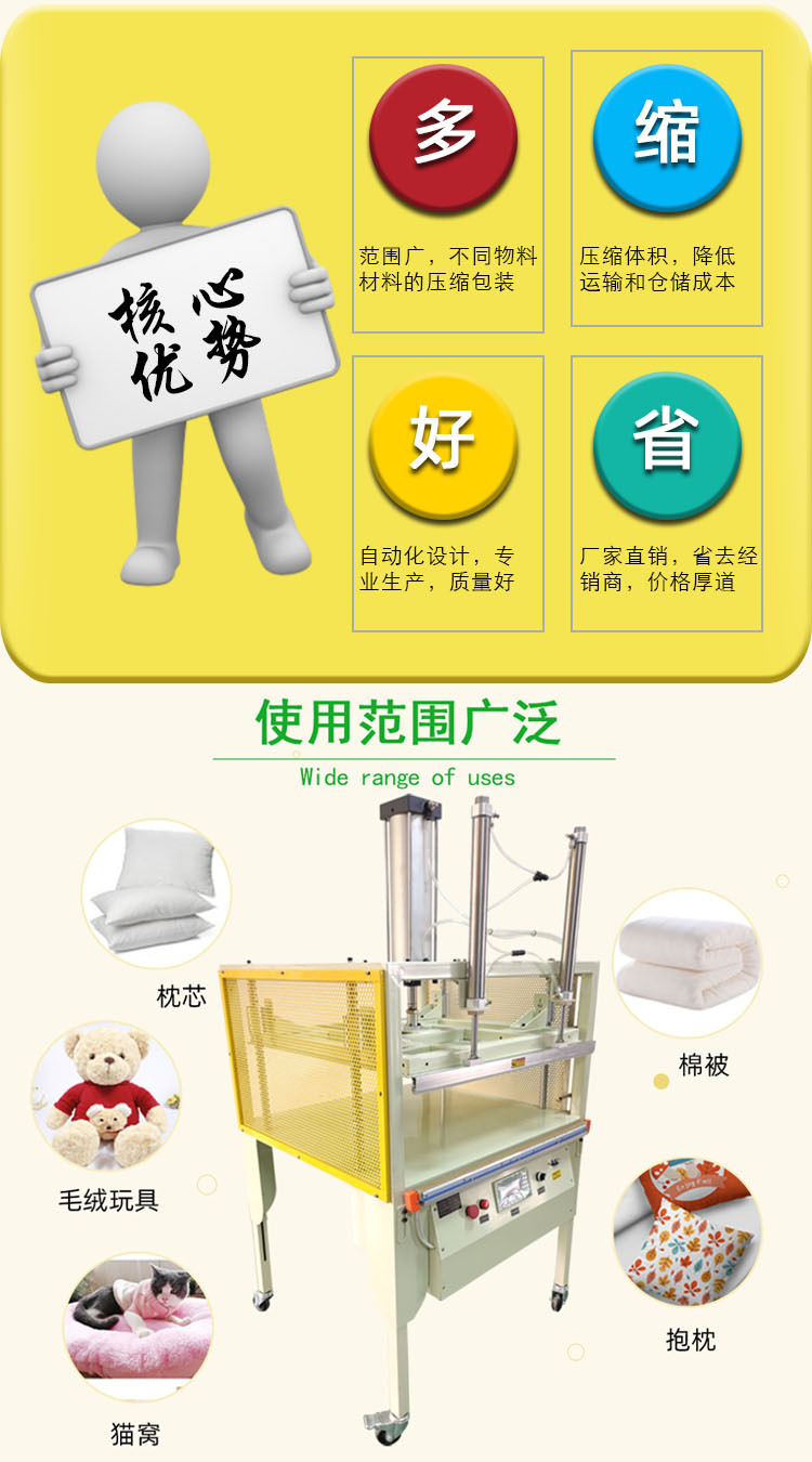 压缩包装机是用以压缩包装羽绒被服,太空棉被服、枕头、靠垫、服装、海绵