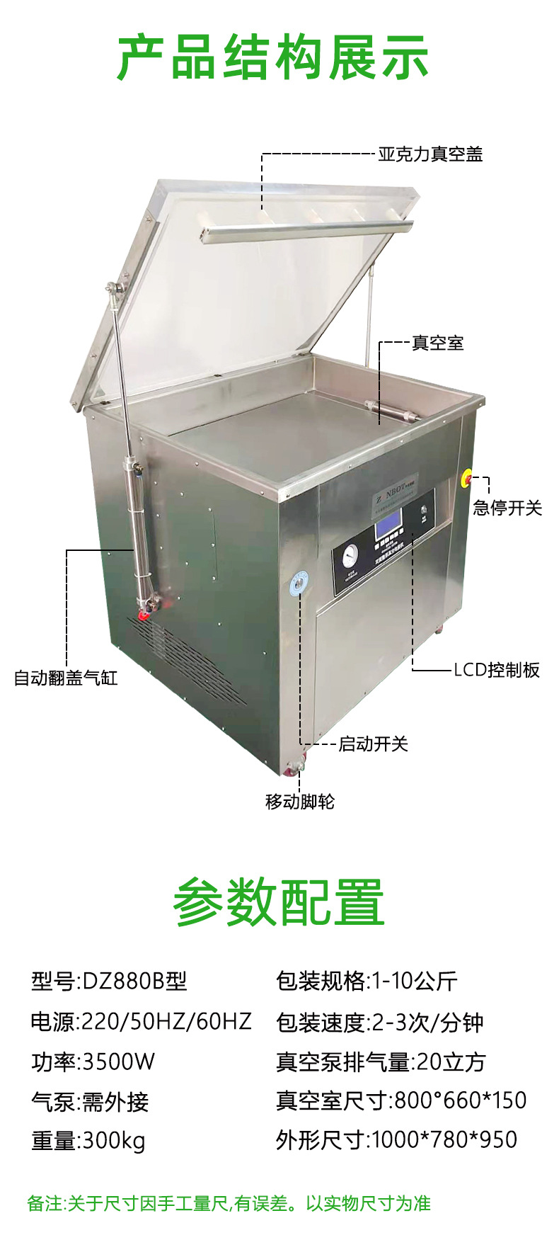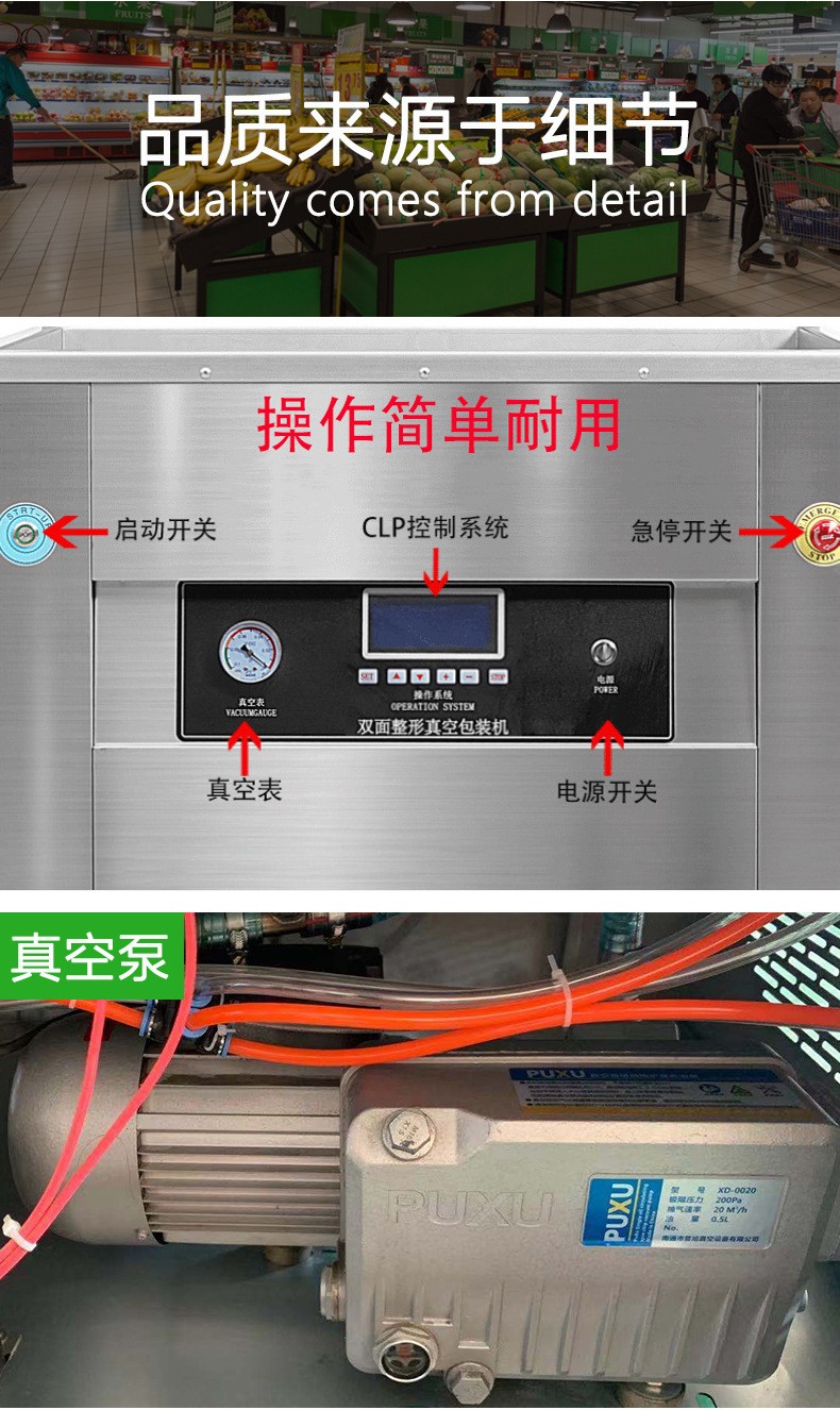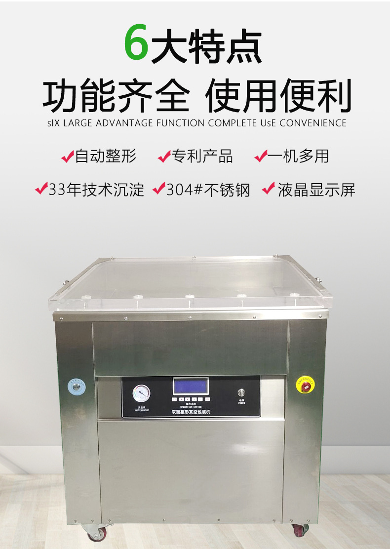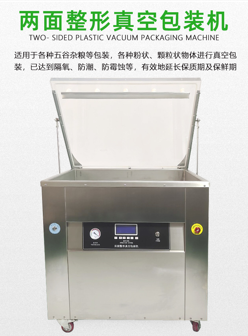 外抽真空包装机通过抽气嘴放到被包装物的包装袋内,抽空空气后完成封口,实现除氧和绝氧的效果。这种功能可以有效防止物料迅速氧化和抑制好氧性细菌的繁殖,从而抑制物料腐败和变质。