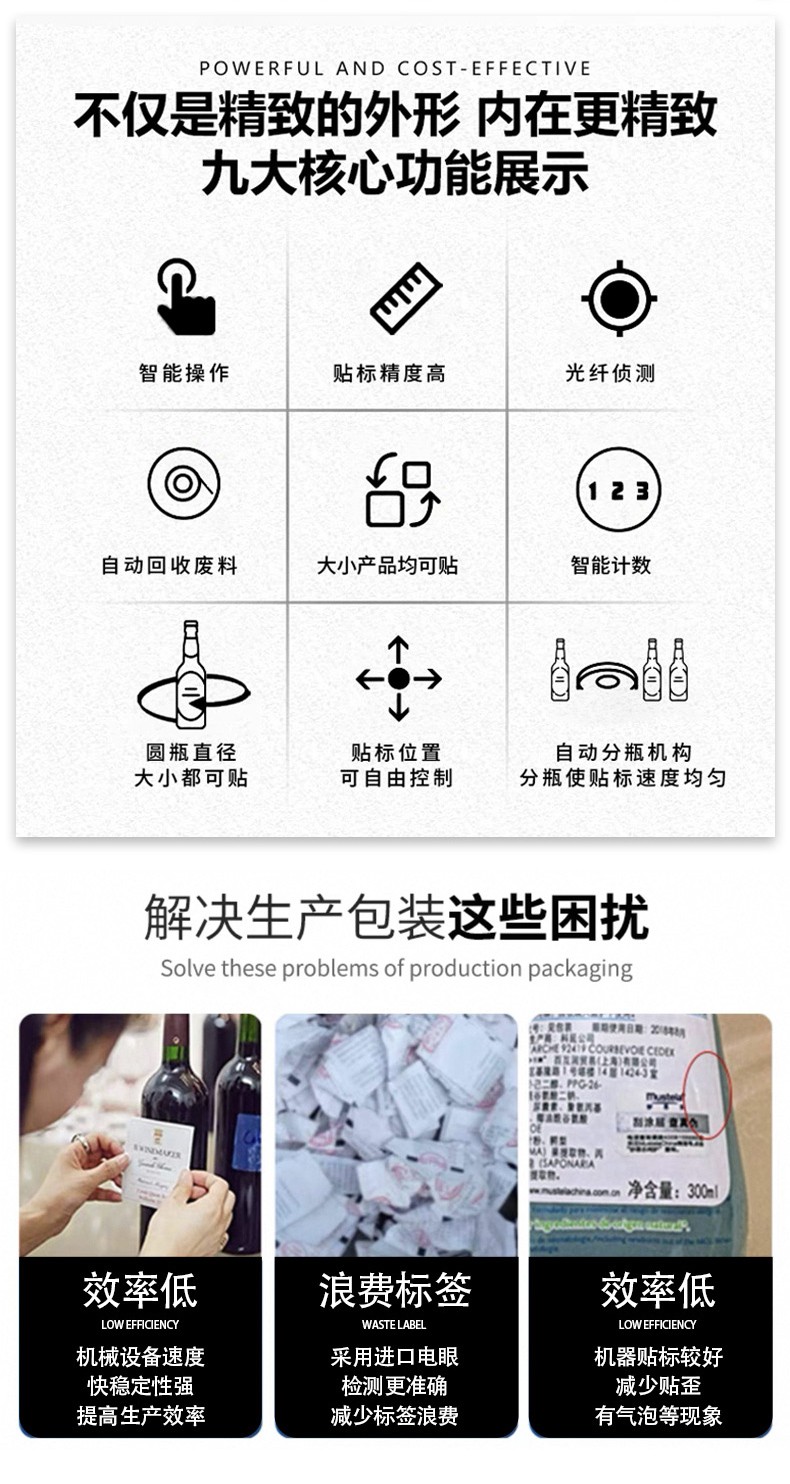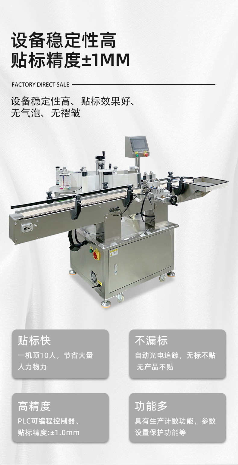 - 贴标:当圆瓶到达贴标位置时,贴标机构的标签牵引装置根据预设的标签长度,将标签从标签卷上牵引出来,贴标头在控制系统的指令下,将标签准确地贴附在圆瓶表面。同时,压标装置对标签进行压实,使其牢固地粘贴在瓶身上。