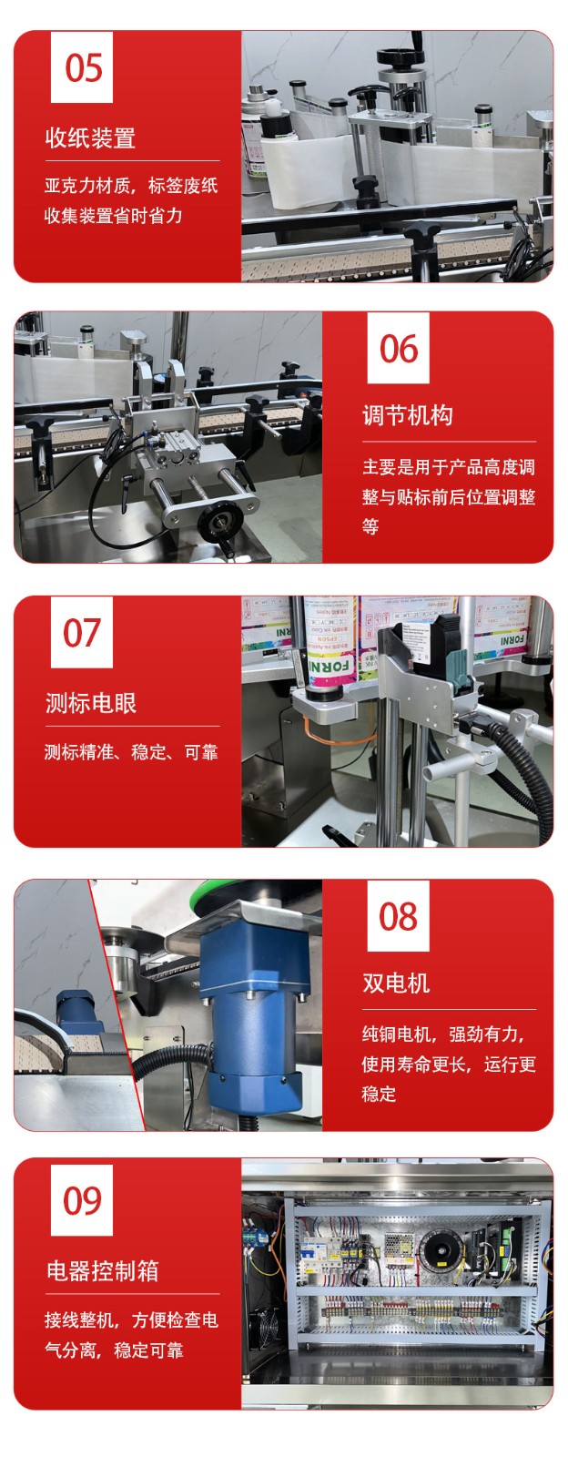 - 贴标机构:主要包括标签放卷装置、标签牵引装置、贴标头和压标装置等。标签放卷装置用于放置标签卷,能自动放卷并保持标签的张力稳定。标签牵引装置通过电机驱动,精确控制标签的输送长度和速度,使其与圆瓶的输送速度相匹配。贴标头采用高精度的机械结构和气动元件,能准确地将标签贴附在圆瓶表面,并且可以根据圆瓶的直径和贴标位置进行调整。压标装置在标签贴附后,对标签进行压实,确保标签与瓶身紧密贴合,无气泡或皱褶。